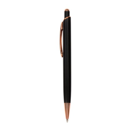 Bolígrafo Metal. Cuerpo de aluminio, rubber finished color negro, muy suave al tacto. Bolígrafo retráctil. Clip, puntera y detalles metálicos color cobre. Tinta azul. Decapa color plata.