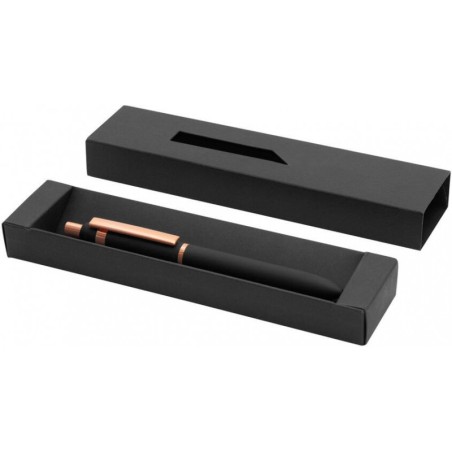 Metal. Cuerpo de aluminio, acabado engomado color negro, muy suave al tacto. Bolígrafo retráctil. Clip, botón y anillos metálicos color cobre. Tinta Azul. Decapa cobre tanto en el cuerpo como en la tapa. Presentación en caja de regalo.