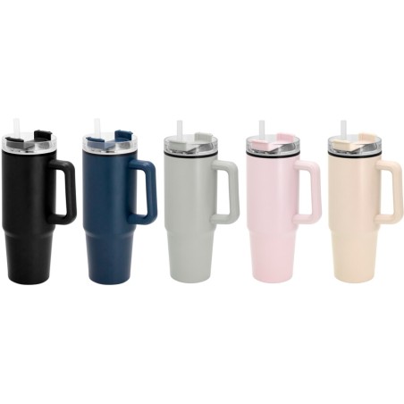 Mug doble pared con sorbete. Interior de plástico Polipropileno y exterior de acero 201. Tapa plástica transparente a rosca con anillo de silicona. Cierre giratorio porta sorbete. Sorbete plástico translucido. Pintura exterior con acabado mate. Mantiene las bebidas frías y calientes por más tiempo.